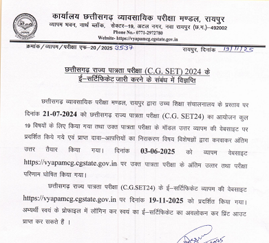 NOTIFICATION REGARDING ISSUANCE OF E CERTIFICATE OF CHHATTISGARH STATE ELIGIBILITY TEST (CG SET ) 2024 :On The proposal Of Directorate Of Higher Education Chhattisgarh Professional examination Board Raipur Organized chhattisgarh State Eligibility Test (C.G. SET 24)On 21.07.2024 For A Total Of 19 Subjects And The Model Answers Of the Said eligibility Test Were Displayed on the Vyapam Website and the final answer was prepared After getting the Receive claims and objection resolved by subjects experts on 03.06.2025 the final answer and exam result of the said eligibility test were declared on the vyapam website https://vyapamcg.cgstate.gov.in/ the e certificate for the chhattisgarh state Eligibility Test (C.G. SET 24) displayed on the vyapam website https://vyapamcg.cgstate.gov.in/ on november